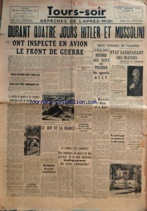 TOURS SOIR du 31/08/1941 - durant 4 jours hitler et mussolini ont inspecte en avion le front de guerre - 3 espions sont fuslles - henri-louis honore comte d'estienne d'orves - maurice-charles-ernest barlier et jean-louis-guillaume daorniky, ainsi que 5 communistes - roger-henri nogarede, raymond justice, andre sigonney , j.l. rapinat et alfred ottino - la marine de guerre et de transport sovietique subit de lourdes pertes - le juif et la france - epidemie de scorbut a djibouti - un cham PDF Online Book. Collection. Read Online TOURS SOIR du 31/08/1941 - durant 4 jours hitler et mussolini ont inspecte en avion le front de guerre - 3 espions sont fuslles - henri-louis honore comte d'estienne d'orves - maurice-charles-ernest barlier et jean-louis-guillaume daorniky, ainsi que 5 communistes - roger-henri nogarede, raymond justice, andre sigonney , j.l. rapinat et alfred ottino - la marine de guerre et de transport sovietique subit de lourdes pertes - le juif et la france - epidemie de scorbut a djibouti - un cham PDF by : ... Book, Free Download Everything We ...